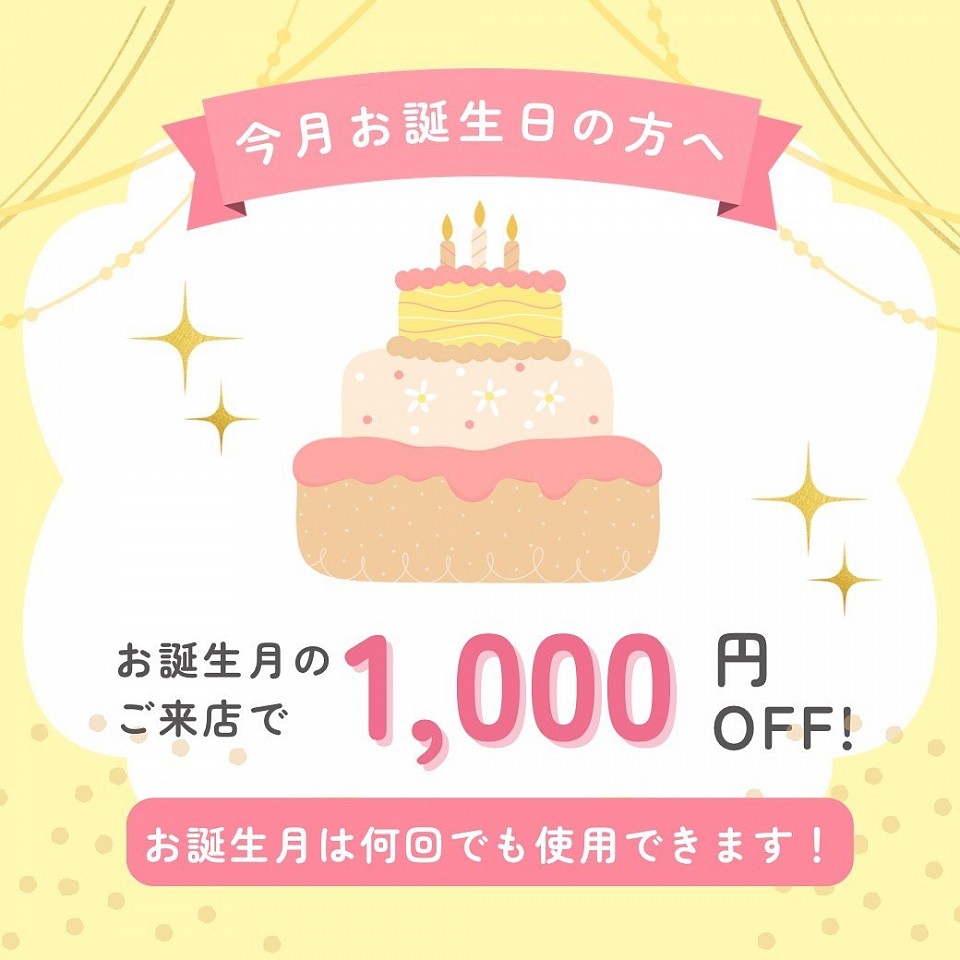 お誕生月のご来店で全てのメニュー対象で1,000円引きになります💕